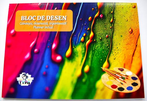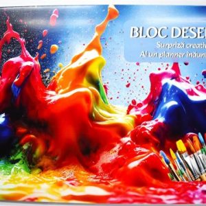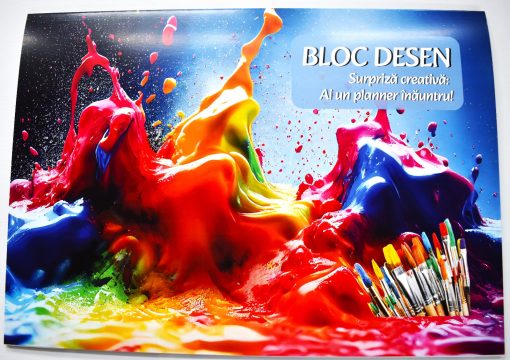 Coperta blocului de desen este realizata din carton, iar colile sunt lipite pe latura lunga.