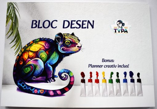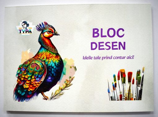 Coperta blocului de desen este realizata din carton, iar colile sunt lipite pe latura lunga.