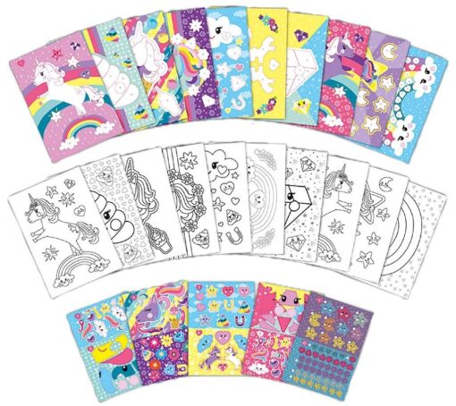 Carte legata in spirala cu 10 puzzle-uri cu autocolante, pagini de colorat si 5 foi cu autocolante cu tema unicorn.