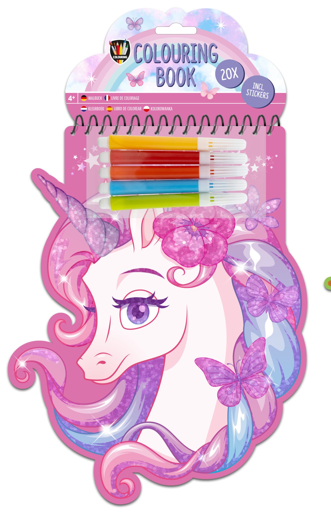 Carte de colorat cu 20 de file, 5 carioci și stickere, în formă de unicorn sau dinozaur.