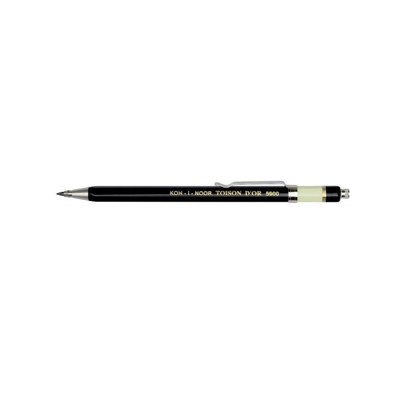 Corpul metalic al creionului Toison D’Or este de forma hexagonala, vopsit in culoare neagra, cu banda alba si aurie la capat si are clip metalic