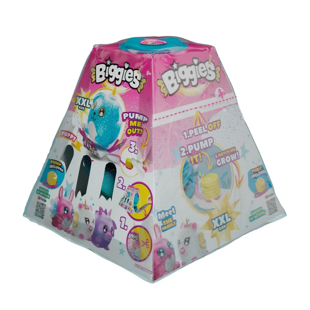 Biggies nu este doar o jucarie de plus obisnuita, este o mega jucarie de plus de dimensiuni impresionante, oferind o experienta captivanta inca de la deschiderea ambalajului. Jucaria de plus vine intr-un ambalaj triunghiular misterios, echipat cu o pompa care va permite sa umflati personajul Biggies cu un efect „PoP”.