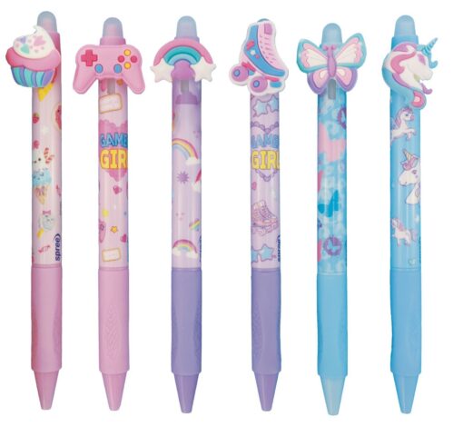 - Design Adorabil “Cute”: Corpul pixului este decorat cu modele pastelate si figurine 3D vesele (unicorn, inghetata, curcubeu), fiind un accesoriu extrem de indragit de elevi.