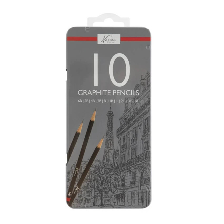 Set 10 Creioane Grafit Nassau Fine Art in Cutie de Metal – Un Cadou de Arta Elegant si Functional